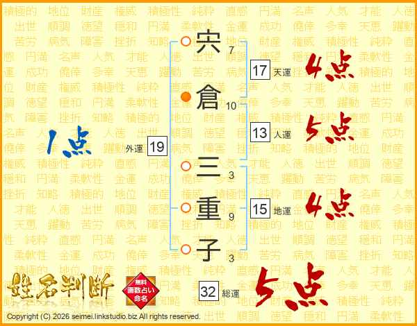 生活面を象徴する運勢です。外部から受ける影響力を表し、結婚運、家庭運や職場、環境への順応性を表します。総運から人運を引いた画数。姓や名が1文字の場合を除く。