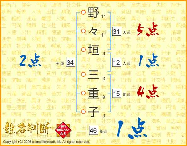野々垣三重子さんの総運は46画の1点!
