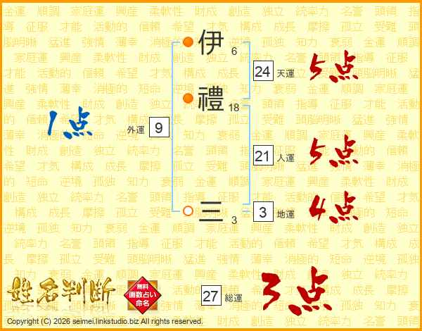 画数の奇数(○陽)と偶数(●陰)の配列で吉凶を占います。どちらかにかたよる名前は大凶名で避ける必要があります。画数の奇数偶数。