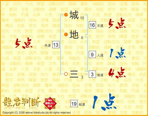 生活面を象徴する運勢です。外部から受ける影響力を表し、結婚運、家庭運や職場、環境への順応性を表します。総運から人運を引いた画数。姓や名が1文字の場合を除く。