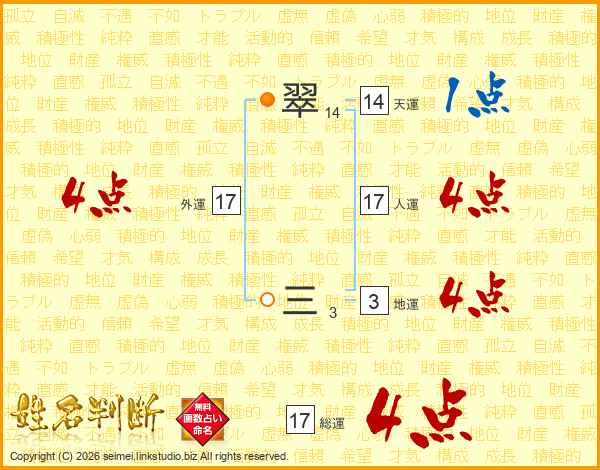 生活面を象徴する運勢です。外部から受ける影響力を表し、結婚運、家庭運や職場、環境への順応性を表します。総運から人運を引いた画数。姓や名が1文字の場合を除く。