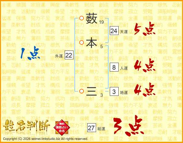 生活面を象徴する運勢です。外部から受ける影響力を表し、結婚運、家庭運や職場、環境への順応性を表します。総運から人運を引いた画数。姓や名が1文字の場合を除く。