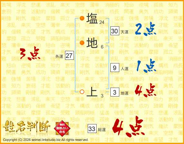 生活面を象徴する運勢です。外部から受ける影響力を表し、結婚運、家庭運や職場、環境への順応性を表します。総運から人運を引いた画数。姓や名が1文字の場合を除く。