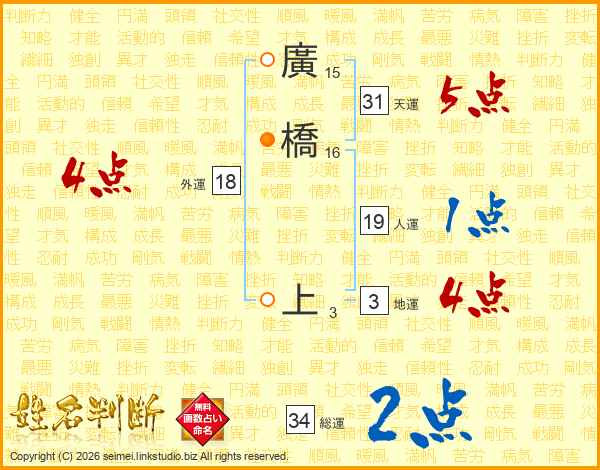 生活面を象徴する運勢です。外部から受ける影響力を表し、結婚運、家庭運や職場、環境への順応性を表します。総運から人運を引いた画数。姓や名が1文字の場合を除く。