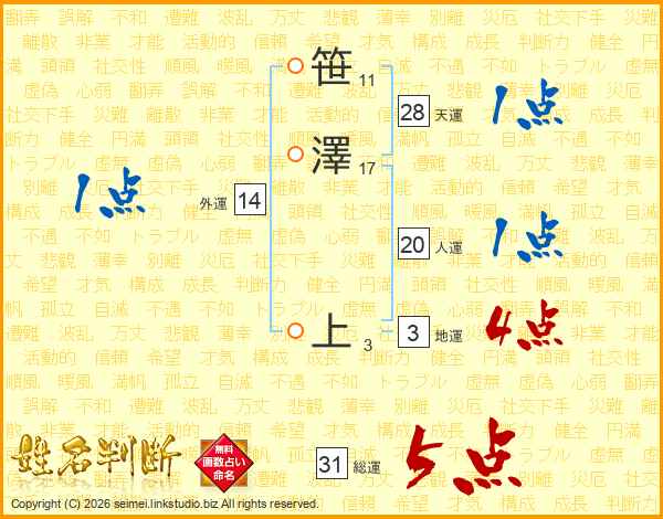 笹澤上さんの総運は31画の5点!