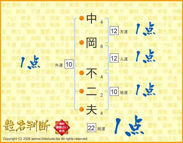 中岡不二夫さんの総運は22画の1点!