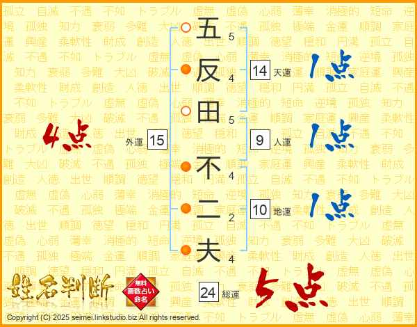 生活面を象徴する運勢です。外部から受ける影響力を表し、結婚運、家庭運や職場、環境への順応性を表します。総運から人運を引いた画数。姓や名が1文字の場合を除く。