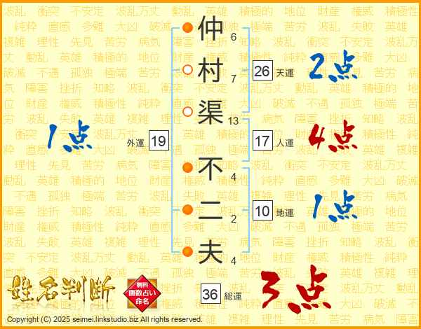仲(6画)村(7画)渠(13画) 不(4画)二(2画)夫(4画)