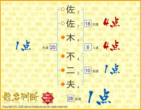 佐(7画)佐(7画)木(4画) 不(4画)二(2画)夫(4画)