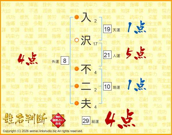 入(2画)沢(17画) 不(4画)二(2画)夫(4画)