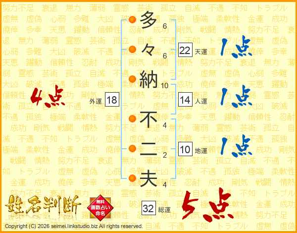 多々納不二夫さんの総運は32画の5点!