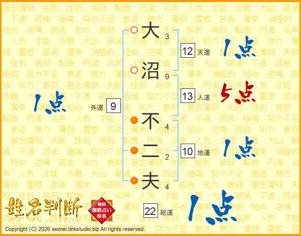 大(3画)沼(9画) 不(4画)二(2画)夫(4画)
