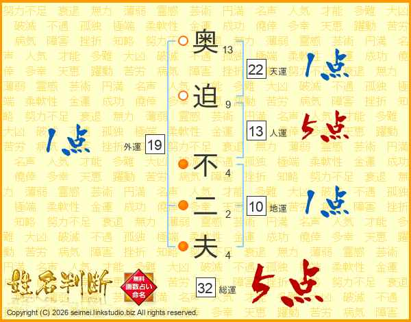 奥迫不二夫さんの総運は32画の5点!