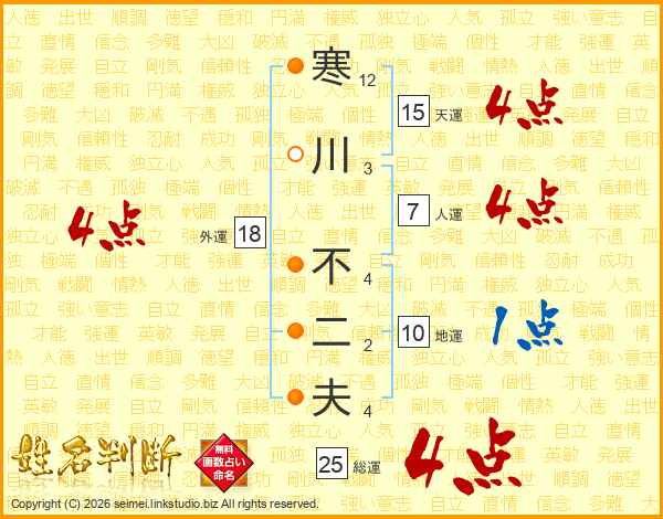 寒川不二夫さんの総運は25画の4点!