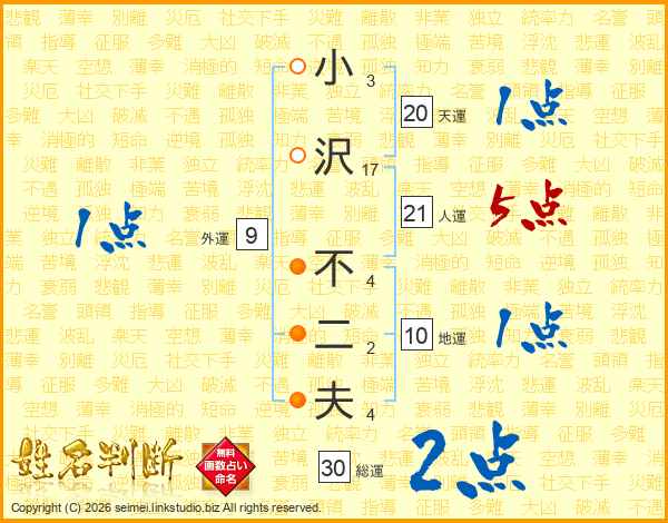 小沢不二夫さんの天運は20画の1点!