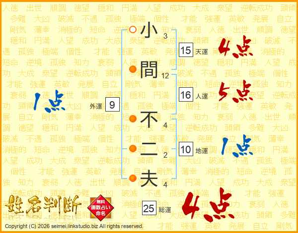 小間不二夫さんの総運は25画の4点!