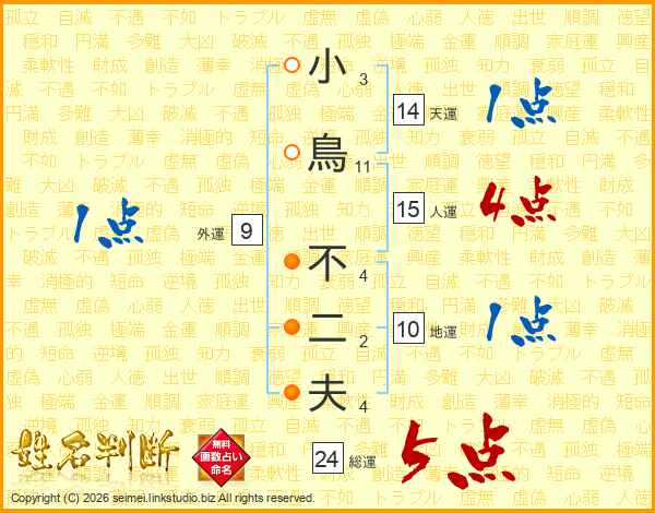 小(3画)鳥(11画) 不(4画)二(2画)夫(4画)