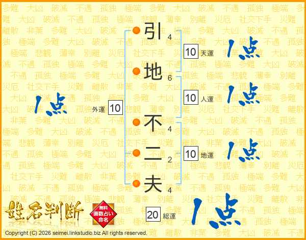 生活面を象徴する運勢です。外部から受ける影響力を表し、結婚運、家庭運や職場、環境への順応性を表します。総運から人運を引いた画数。姓や名が1文字の場合を除く。