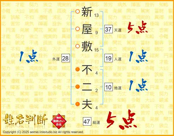 新(13画)屋(9画)敷(15画) 不(4画)二(2画)夫(4画)