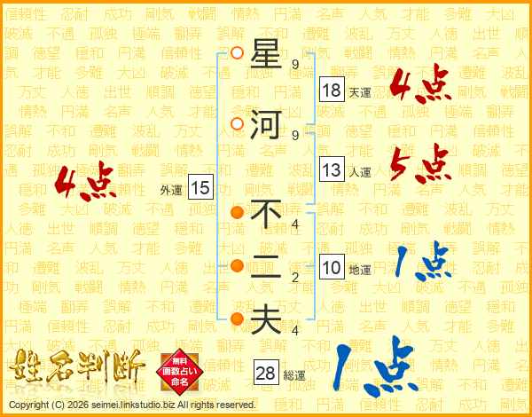 星(9画)河(9画) 不(4画)二(2画)夫(4画)