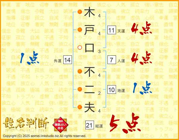 木(4画)戸(4画)口(3画) 不(4画)二(2画)夫(4画)