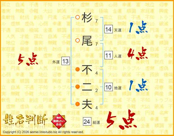 杉(7画)尾(7画) 不(4画)二(2画)夫(4画)