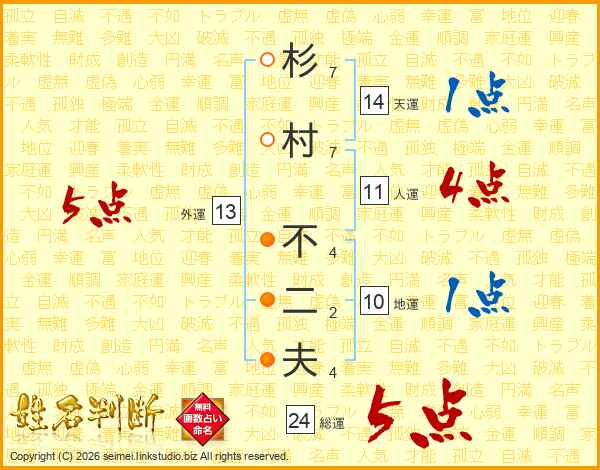 杉(7画)村(7画) 不(4画)二(2画)夫(4画)