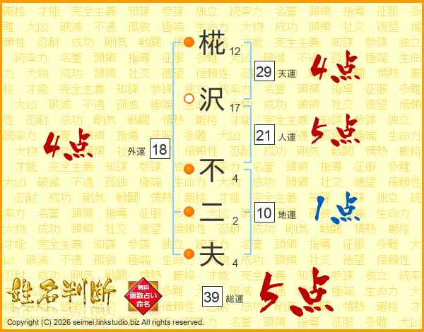 椛沢不二夫さんの総運は39画の5点!