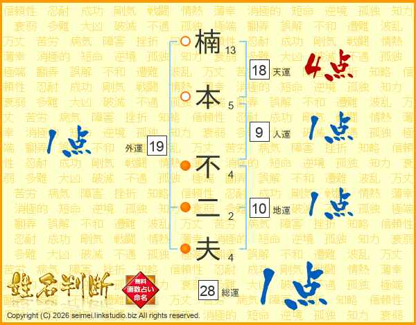 楠(13画)本(5画) 不(4画)二(2画)夫(4画)