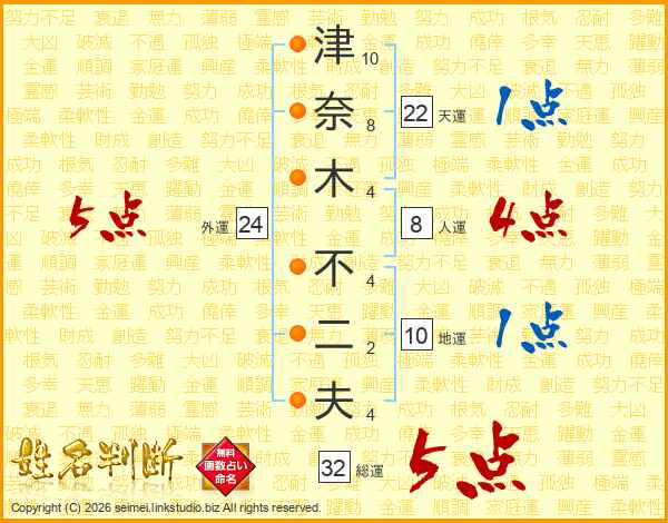津奈木不二夫さんの総運は32画の5点!