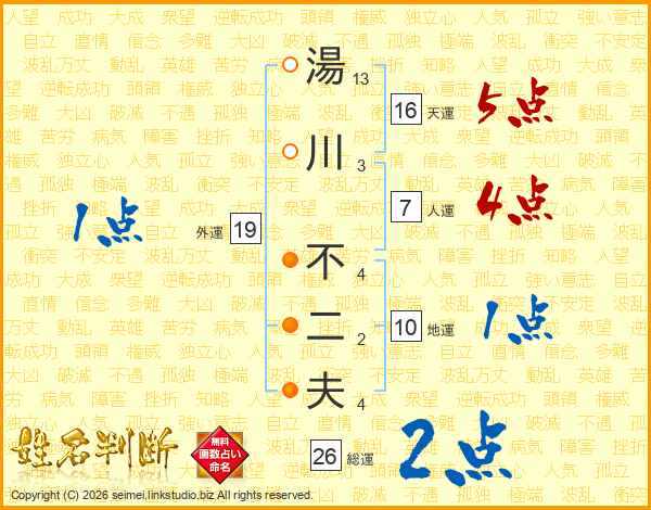 湯川不二夫さんの総運は26画の2点!