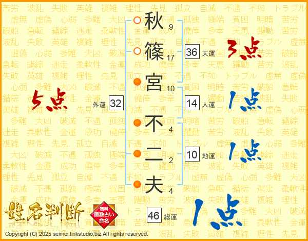 秋篠宮不二夫さんの総運は46画の1点!