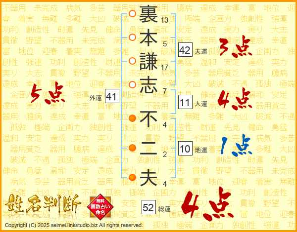 裏(13画)本(5画)謙(17画)志(7画) 不(4画)二(2画)夫(4画)