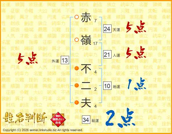 赤(7画)嶺(17画) 不(4画)二(2画)夫(4画)