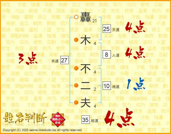 轟木不二夫さんの天運は25画の4点!