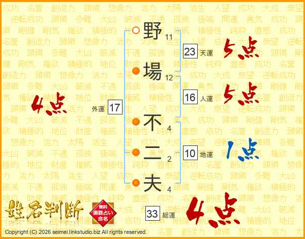 野(11画)場(12画) 不(4画)二(2画)夫(4画)