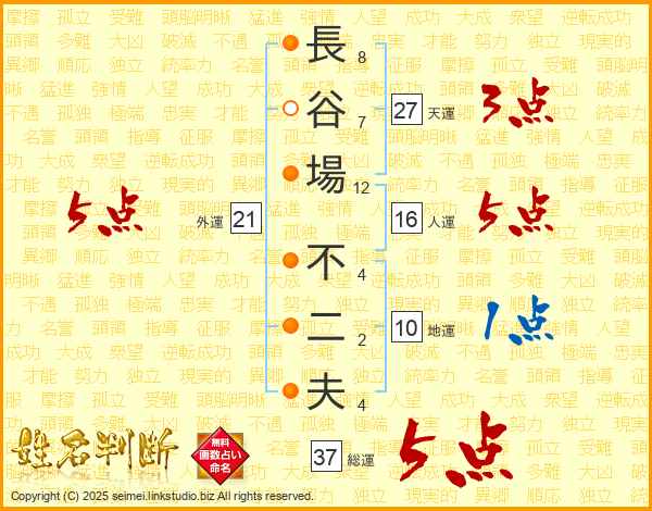 長谷場不二夫さんの総運は37画の5点!