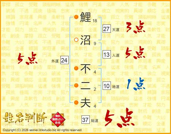 鯉(18画)沼(9画) 不(4画)二(2画)夫(4画)