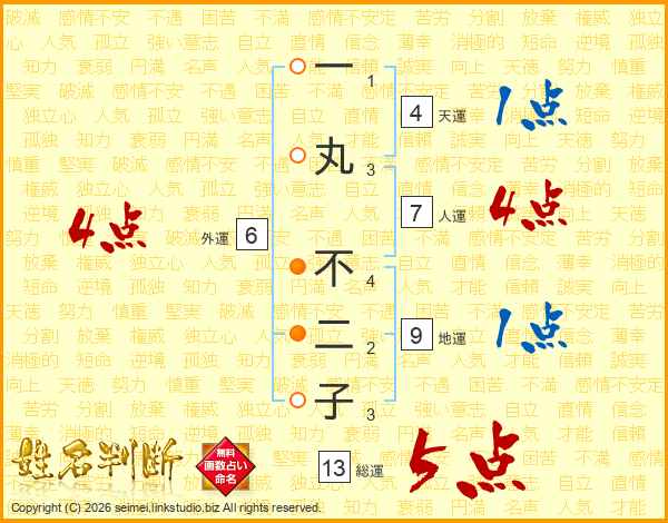 画数の奇数(○陽)と偶数(●陰)の配列で吉凶を占います。どちらかにかたよる名前は大凶名で避ける必要があります。画数の奇数偶数。