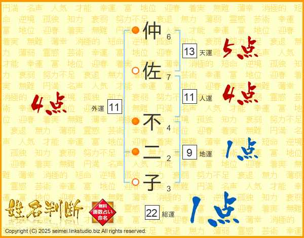 仲(6画)佐(7画) 不(4画)二(2画)子(3画)