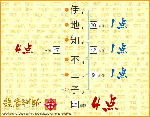 伊(6画)地(6画)知(8画) 不(4画)二(2画)子(3画)