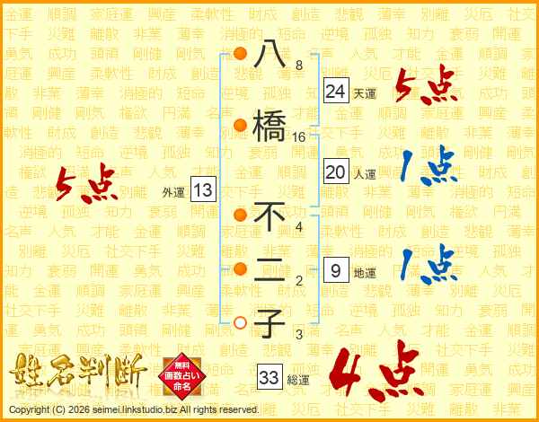 八(8画)橋(16画) 不(4画)二(2画)子(3画)