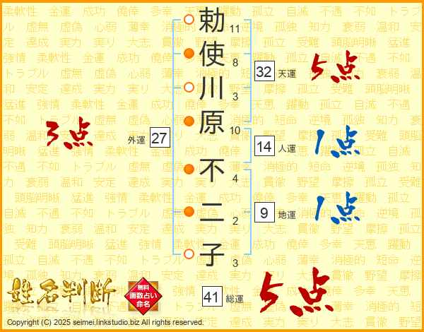 勅(11画)使(8画)川(3画)原(10画) 不(4画)二(2画)子(3画)