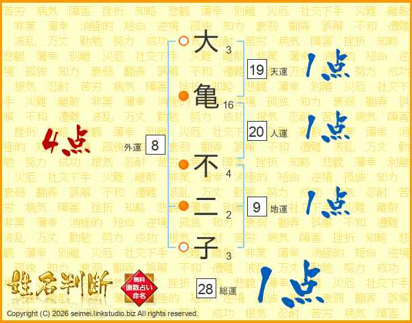 大(3画)亀(16画) 不(4画)二(2画)子(3画)
