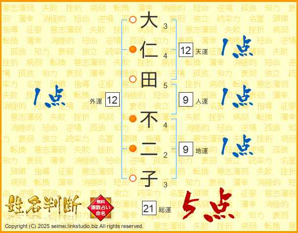 大(3画)仁(4画)田(5画) 不(4画)二(2画)子(3画)