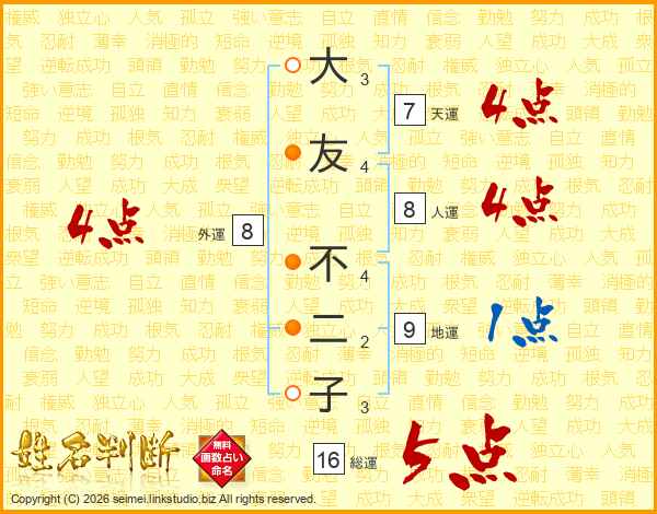 大(3画)友(4画) 不(4画)二(2画)子(3画)