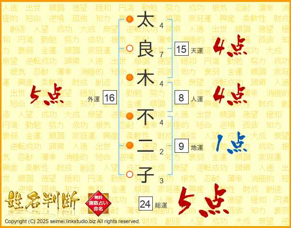 太(4画)良(7画)木(4画) 不(4画)二(2画)子(3画)