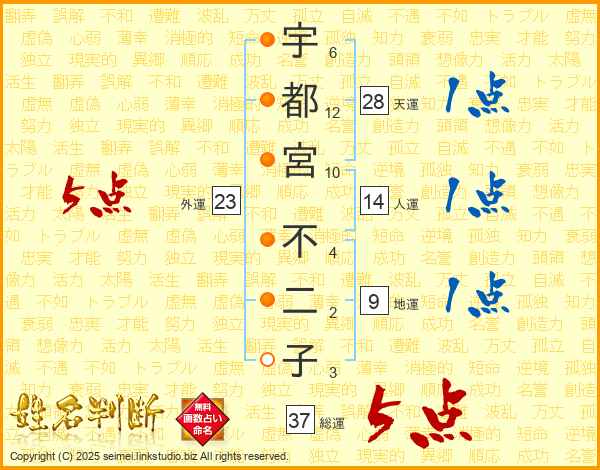 宇(6画)都(12画)宮(10画) 不(4画)二(2画)子(3画)