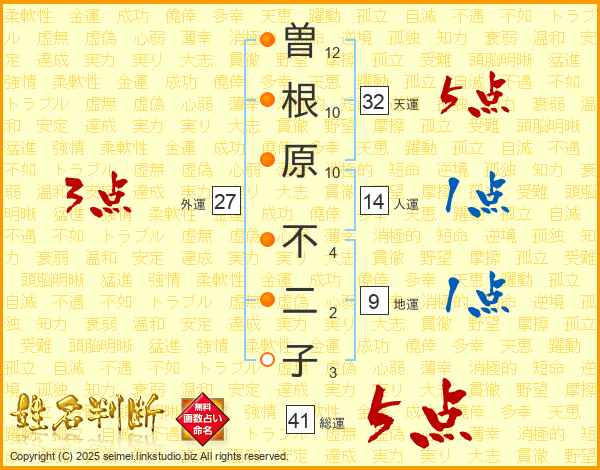 曽根原不二子さんの総運は41画の5点!
