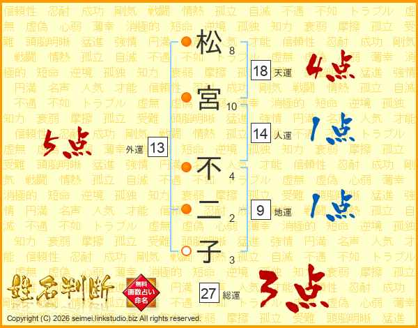松宮不二子さんの総運は27画の3点!